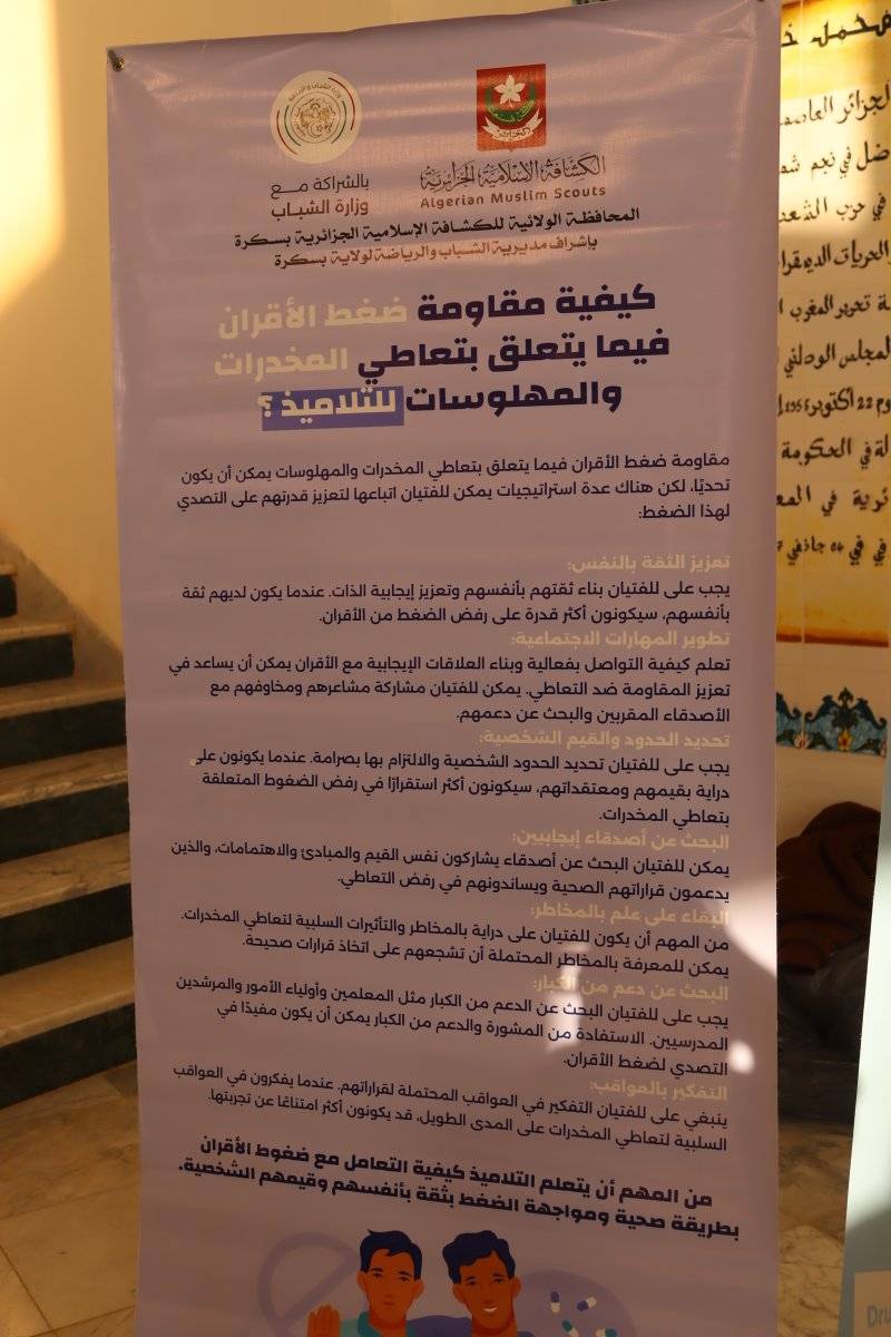 كما شهد فضاء قاعة المحاضرات معارضا وجداريات توعوية من تنظيم نوادي كلية العلوم الانسانية والاجتماعية بمشاركة مركز الوسيط لعلاج الإدمان، والكشافة الإسلامية الجزائرية، عكست إبداع الطلبة ووعيهم بأهمية المساهمة في نشر الثقافة الوقائية داخل الحرم الجامعي.
